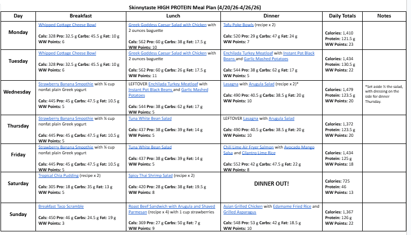 A free, 7-day excessive protein food regimen meal plan together with breakfast, lunch and dinner concepts and a buying record. All recipes embody macros and Weight Watchers factors.